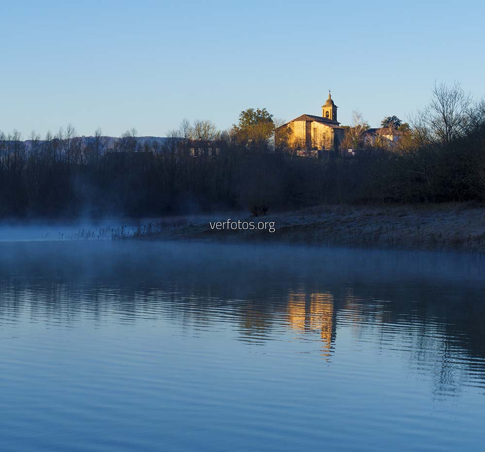 Descripci贸n: Amanecer en el embalse de Urkulu. El sol ilumina la Iglesia de San Juan en el barrio de Aozaratza, junto al pantano de Urkulu, municipio de Aretxabaleta, Euskadi