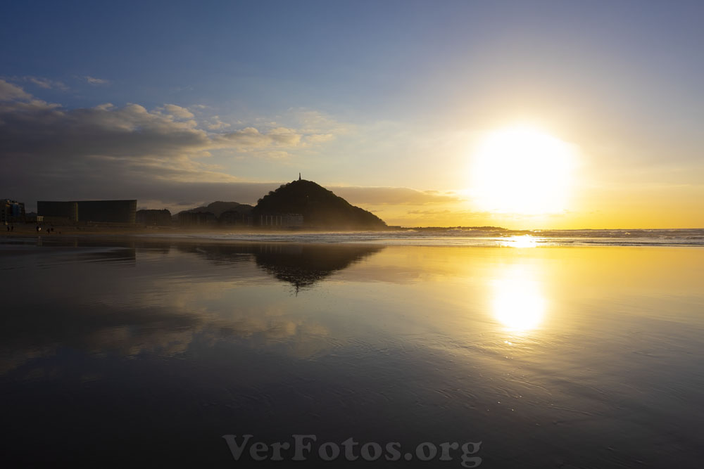 Descripción: Atardecer en el Monte Urgull. Monte Urgull reflejado en la playa, ciudad de Donostia, Euskadi
