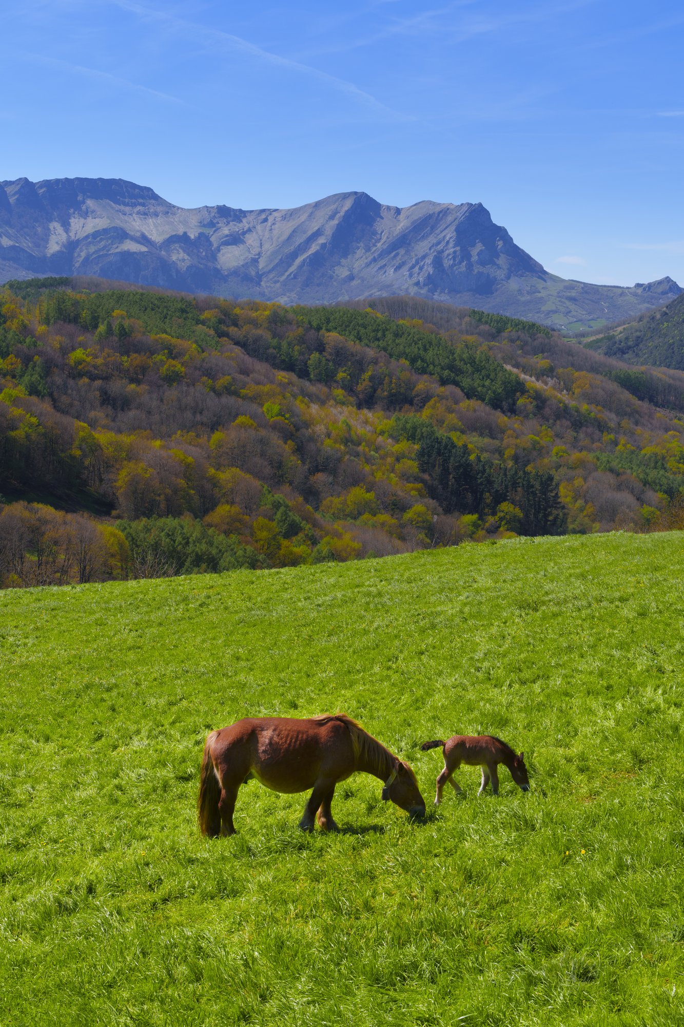Caballos pastando en los prados de la Sierra de Aralar, Navarra. Las Maioak se ven al fondo, con su perfil inconfundible sobre el cielo. Esta imagen captura la esencia del paisaje navarro: naturaleza, tradición y serenidad. Los equinos conviven en un prado de Aralar en una escena bucólica. Perfecta para quienes buscan fotografía de naturaleza, turismo rural o inspiración para viajes por Euskadi y los Pirineos.