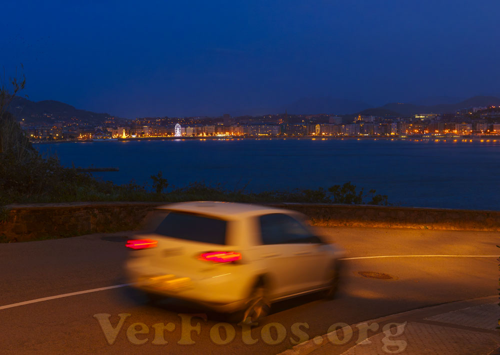 Descripci贸n: Coche hacia la ciudad de Donostia. Vahículo circulando en la noche a la ciudad de Donostia - San Sebastian, Euskadi