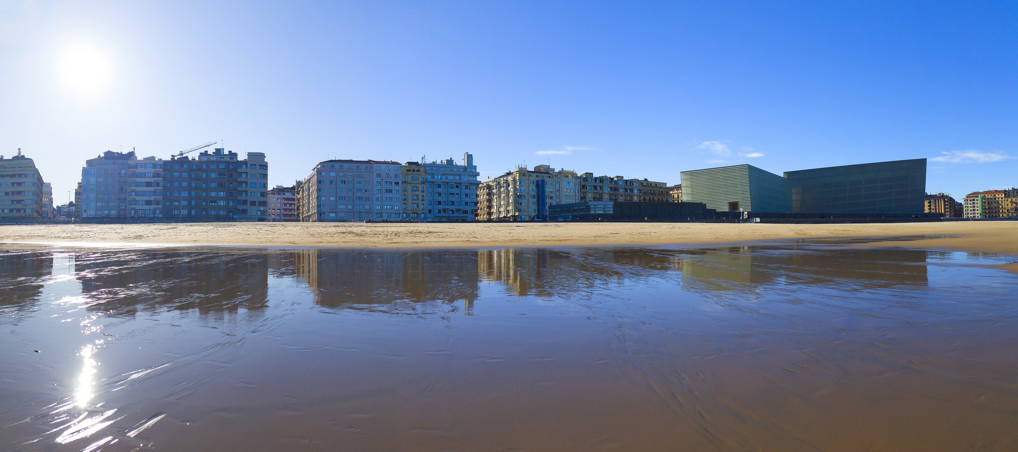 Un día radiante baña San Sebastián, donde el cielo azul y el sol de la mañana convierten la Playa de la Zurriola en un enorme espejo celeste. El agua retenida en la arena refleja la fachada marítima de la ciudad, desde el Palacio de Congresos hasta los edificios del barrio de Gros.