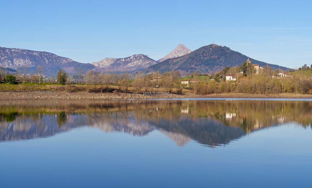Descripción: Embalse de Urkulu y monte Anboto. Embalse de Urkulu, Iglesia de Larrino y monte Anboto al fondo, Euskadi