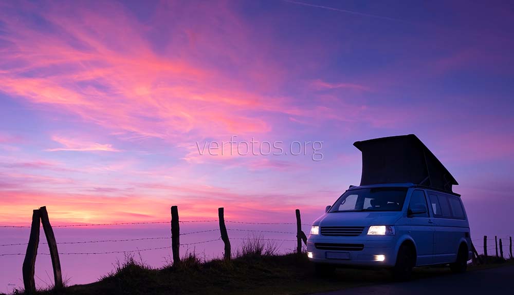 Descripci贸n: Furgoneta al atardecer sobre el mar en el monte Jaizkibel, Euskadi