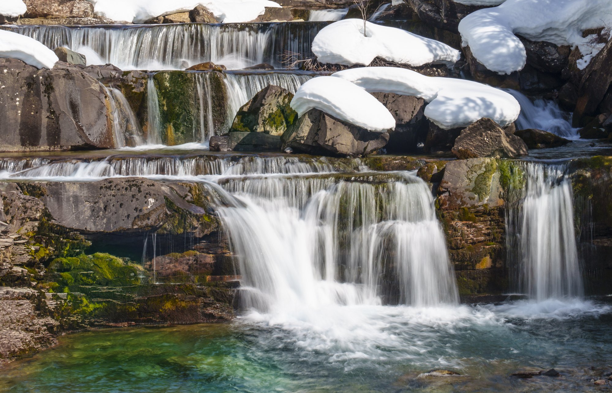 La fotografía muestra un impresionante primer plano de las Gradas de Soaso, en el Parque Nacional de Ordesa, Huesca, donde la nieve cubre suavemente los escalones de piedra. Este icónico paisaje destaca por sus cascadas que fluyen con fuerza, rodeadas de un manto blanco que les otorga un aire mágico. La escena invita a los visitantes a disfrutar de la tranquilidad y esplendor de la naturaleza, un recordatorio de la belleza invernal que transforma el Parque Nacional en un paraíso nevado.