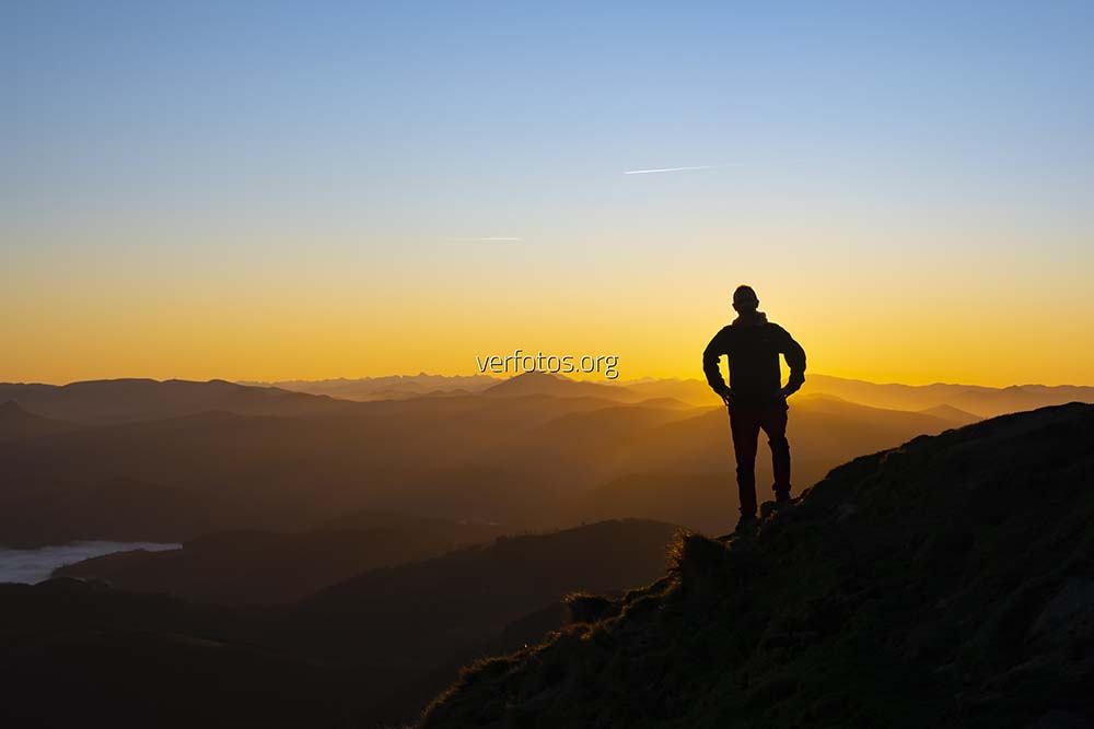 Descripci贸n: Hombre a contraluz. Senderista en el Parque Natural de Aiako Harriak al amanecer, Euskadi