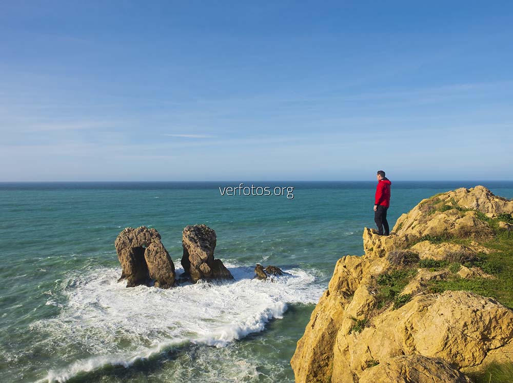 Descripci贸n: Hombre en los acantilados mirando a los Urros de Liencres, Cantabria