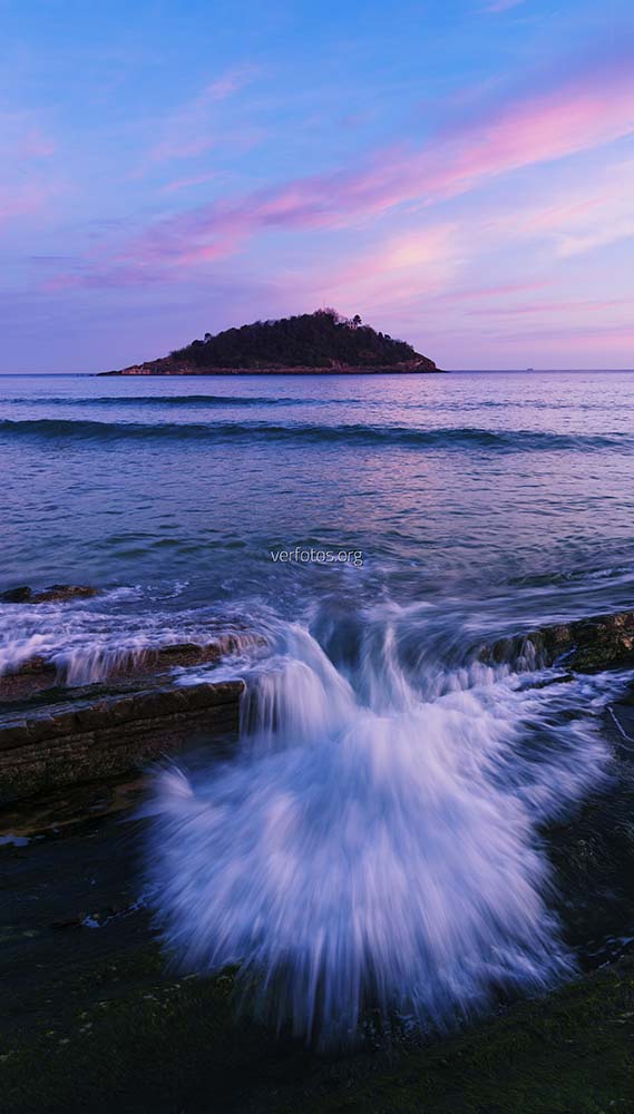 Descripción: Isla Santa Clara en Donosti. Olas en la playa de la concha con la isla Santa Clara al fondo, ciudad de Donostia San Sebastian, Euskadi