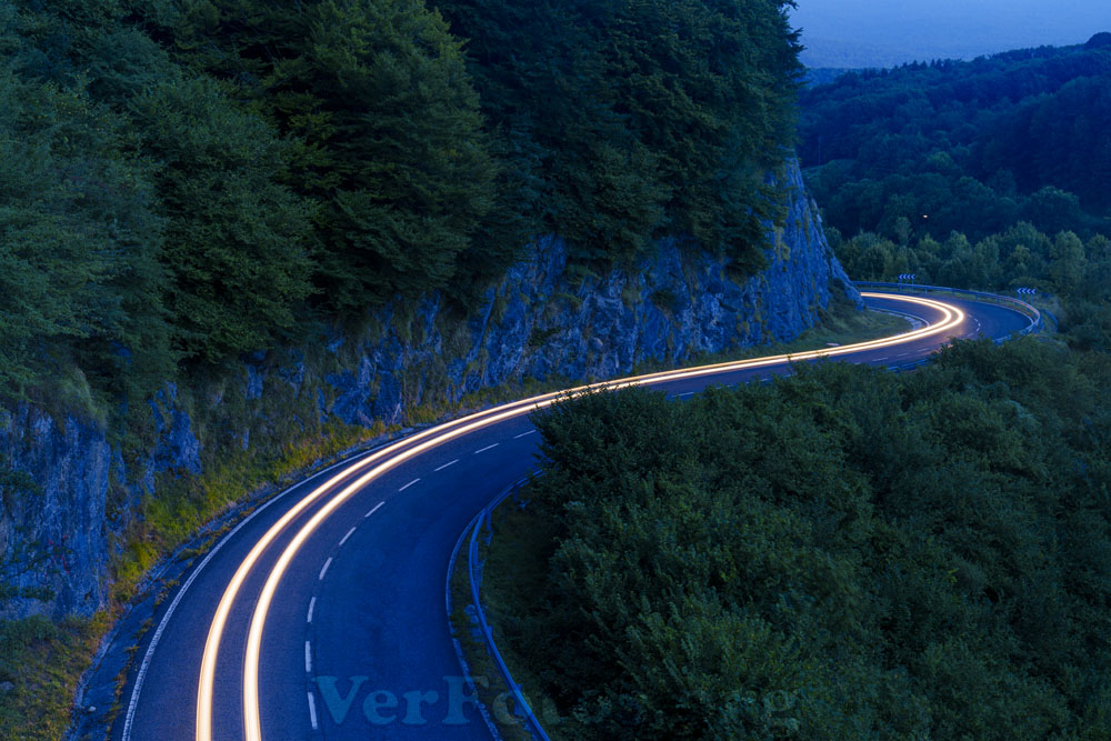 Descripci贸n: Luces de Coche por la noche. Carretera de montaña en Lekunberri, Navarra