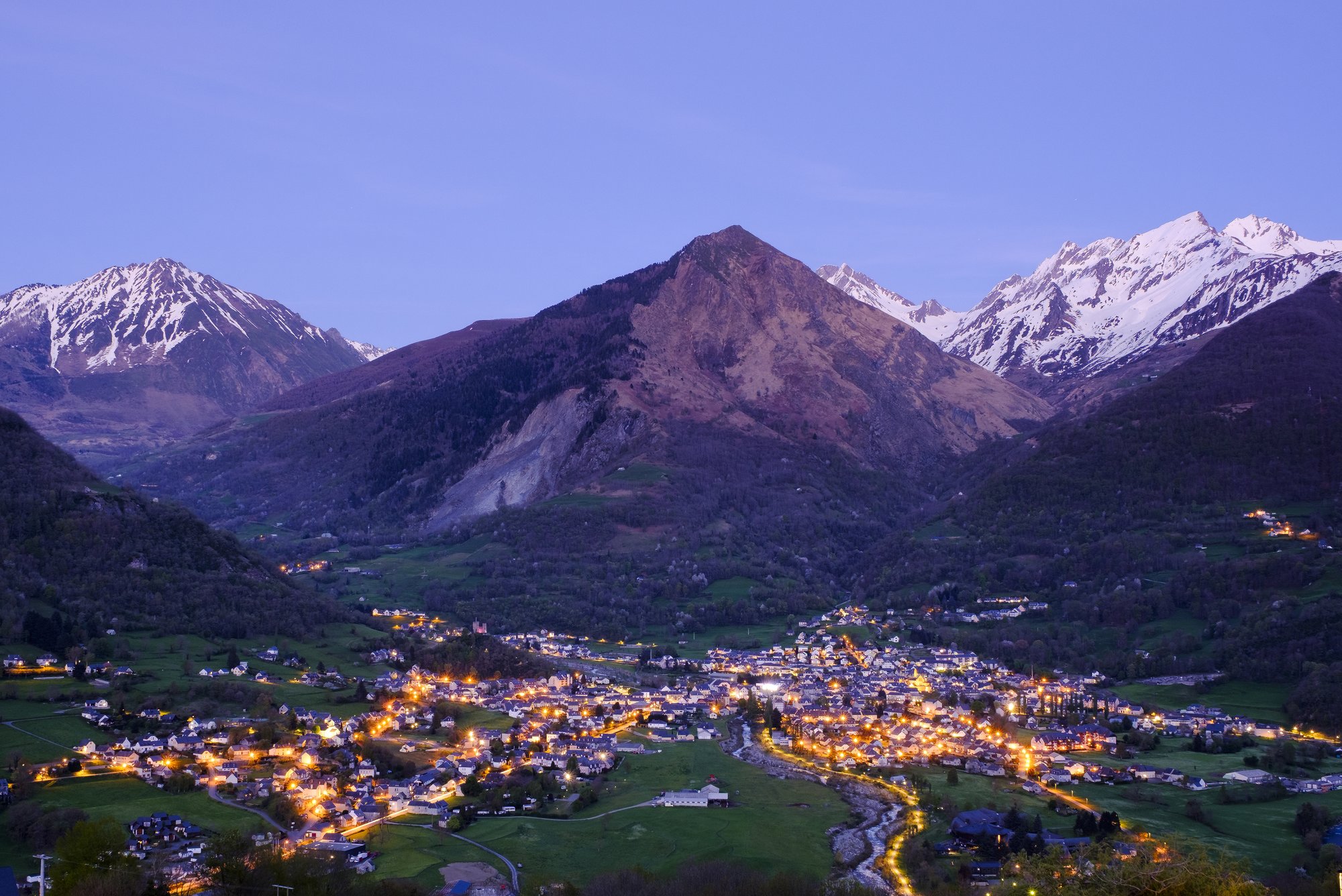 Disfruta de esta espectacular fotografía gratuita de Luz-Saint-Sauveur al anochecer. La imagen captura la esencia de esta ciudad turística en Francia, con sus cálidas luces urbanas contrastando con la nieve virgen de los Pirineos. Ideal para proyectos de viajes, blogs de invierno o fondos de pantalla épicos. Descarga esta foto solidaria y apoya el arte libre con un solo clic en nuestra plataforma.