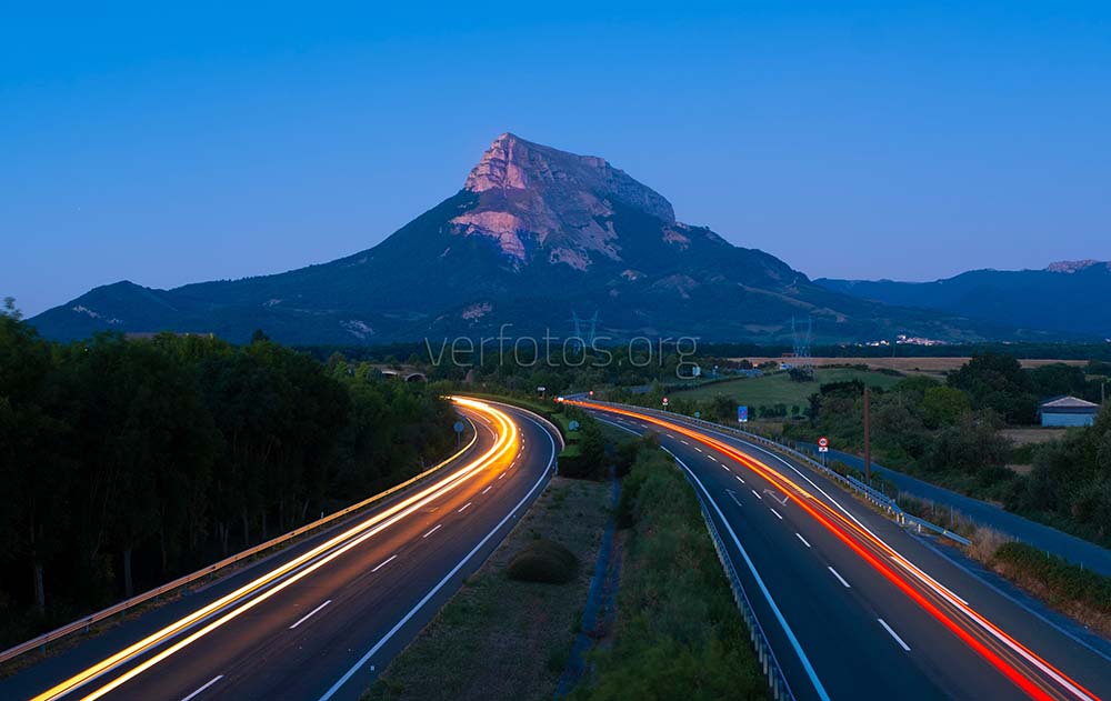 Descripci贸n: Luces de coche en la autopista A10 con el monte San Donato (Beriain) al fondo, Navarra
