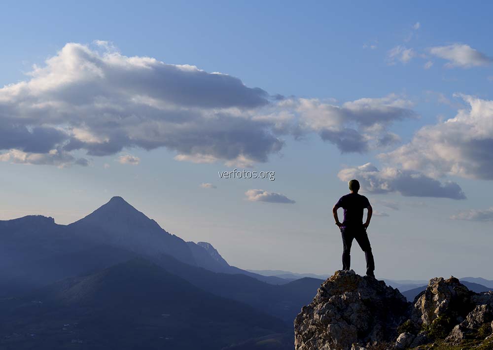 Descripci贸n: Monte Orkatzategi. Senderista en el monte Orkatzategi con el monte Anboto al fondo, euskadi