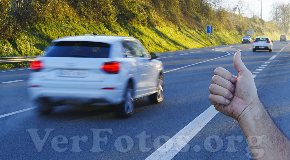 Descripción: Persona haciendo autostop junto a la carretera.