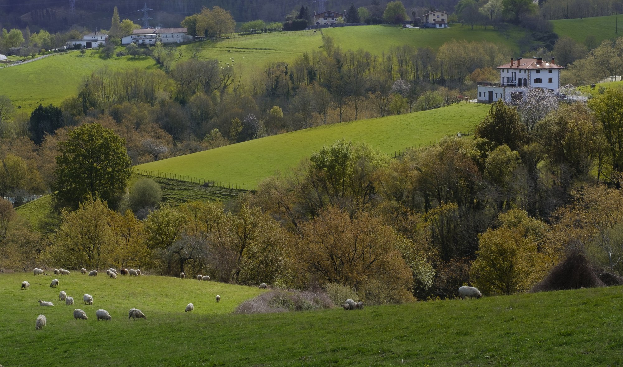 En Urnieta, Euskadi, prados verdes de primavera acogen rebaños de ovejas junto a caseríos tradicionales. La imagen muestra paisaje rural con tonos naturales y luz difusa. Sin elementos artificiales, la escena refleja actividad ganadera y entorno agrícola de Gipuzkoa. Fotografía documental de la vida en el campo vasco, con enfoque en la relación entre ganado, tierra y arquitectura rural durante la estación de crecimiento vegetal.
