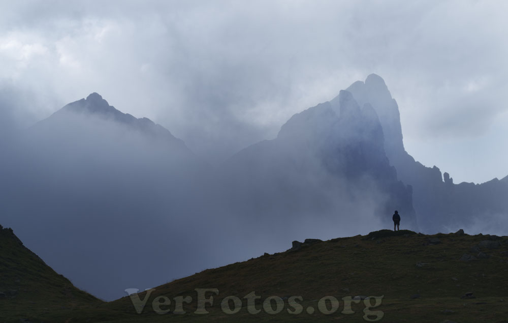Descripci贸n: Senderista con nubes y tormenta. Senderista caminando en el Circo de Lescun, Francia