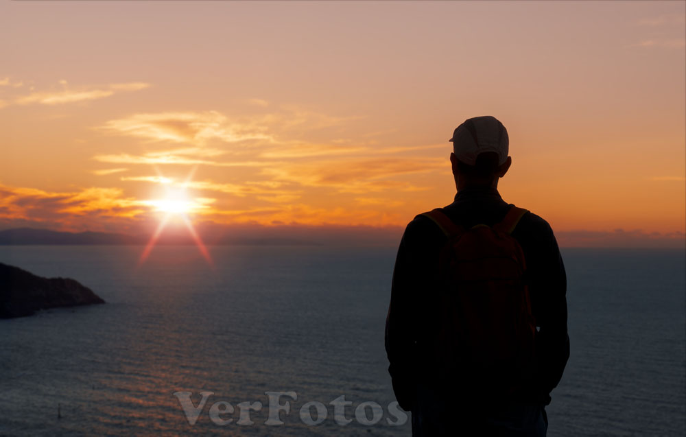 Descripci贸n: Senderista en el Camino del Norte. Atardecer en el monte Jaizkibel, Euskadi