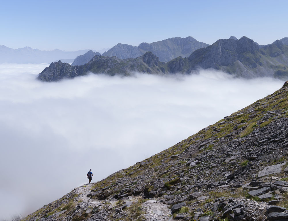 Descripción: Senderista en el Collado de Petrechema. Senderista en la Senda de Camile, ruta de las golondrinas, circo de Lescun, Francia