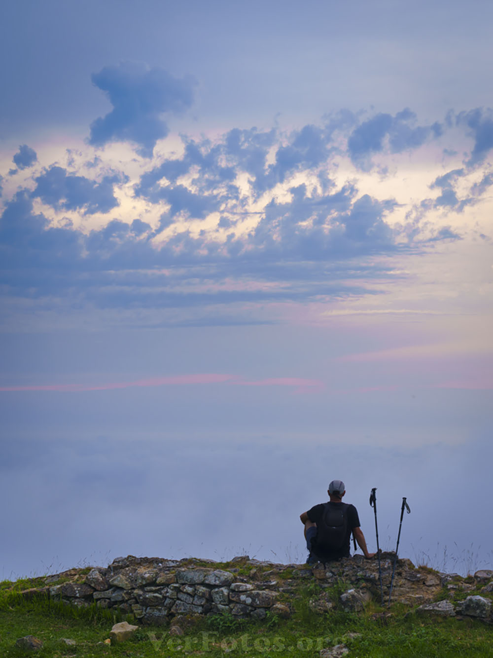 Descripción: Senderista en el camino del norte. Senderista al atardecer en el camino de Santiago del Norte, monte Jaizkibel, Euskadi