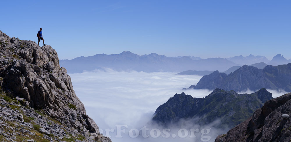 Descripción: Senderista en la ruta de las Golondrinas. Senderista en la Senda de Camile, ruta de las golondrinas, circo de Lescun, Francia
