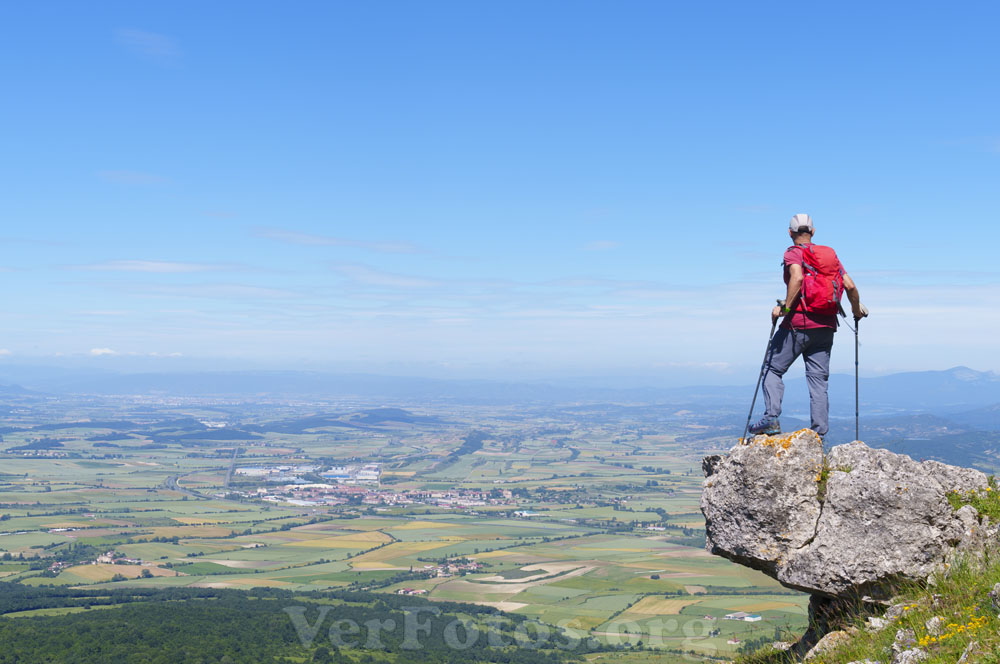 Descripci贸n: Senderista sobre Agurain. Senderista sobre un acantilado en el monte Baio, sierra de Entzia, Euskadi