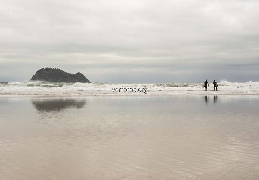 Descripci贸n: Surf en Zarautz. Surfistas en la playa de Zarautz con el ratón de Getaria al fondo, Euskadi