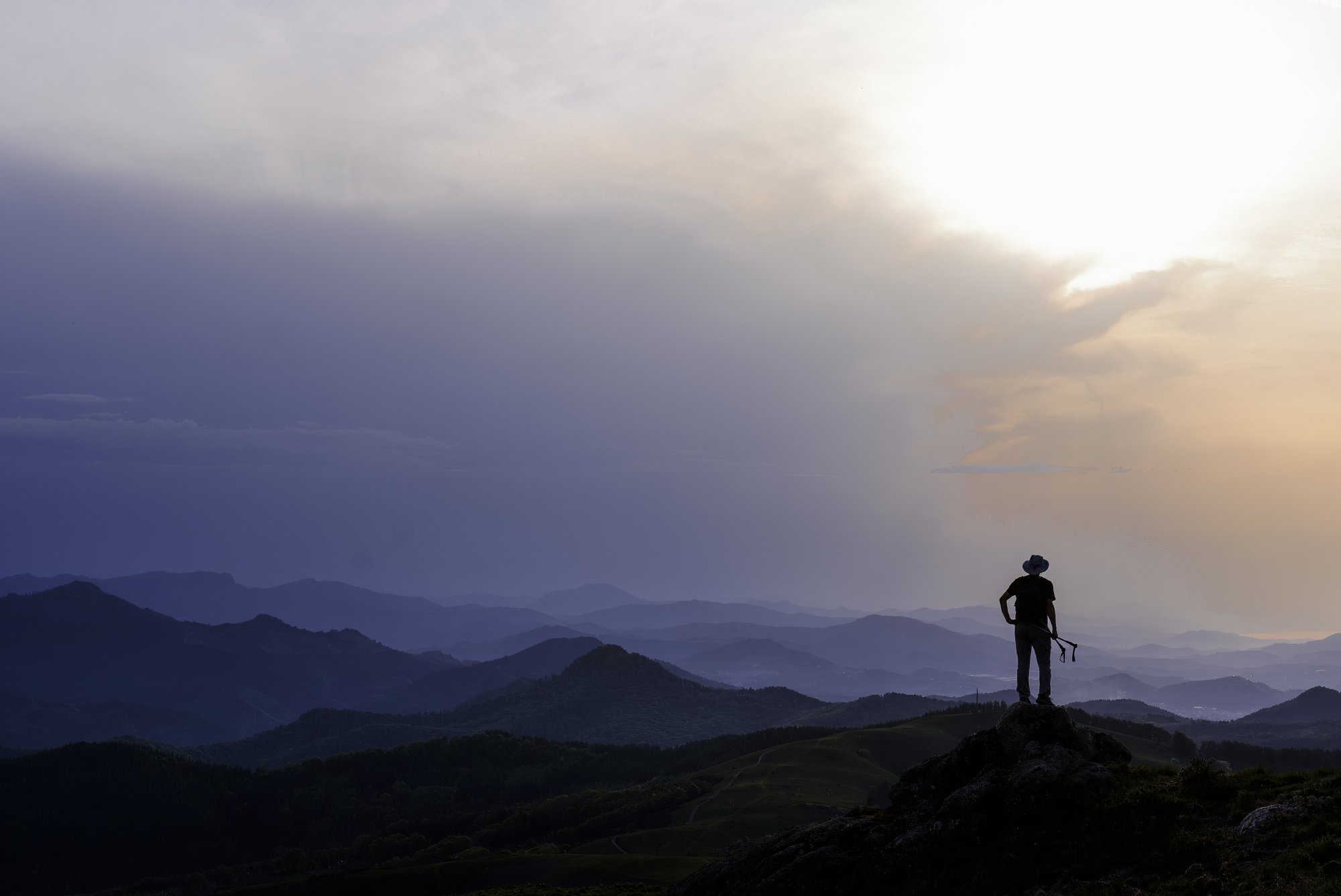 Descripción: Tormenta en Aiako Harriak: senderista al atardecer. Tormenta de primavera avanza sobre los cielos de Gipuzkoa mientras un senderista la contempla en silencio al atardecer. Vista desde el Parque Natural de Aiako Harriak, en Euskadi, esta fotografía gratuita y solidaria captura la tensión entre calma y tormenta, luz cálida y nubes oscuras. Imagen de alta resolución ideal para proyectos de naturaleza, turismo rural, senderismo, meteorología y paisajes del País Vasco. Descarga libre, crédito al autor solicitado.