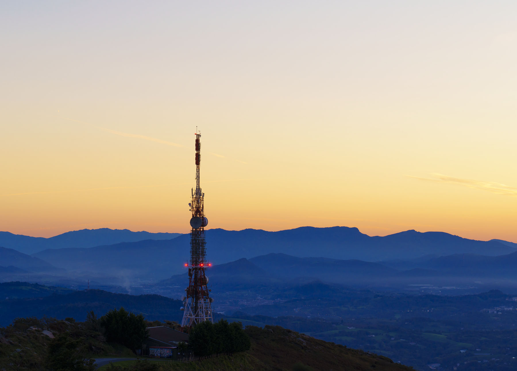 Descripción: Torre de comunicaciones al anochecer. Antenas en el monte Jaizkibel, Euskadi