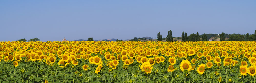 Descripción: Un radiante campo de girasoles brilla bajo el sol en la Llanada Alavesa, Euskadi. Las flores amarillas miran al cielo y un horizonte lleno de luz natural.