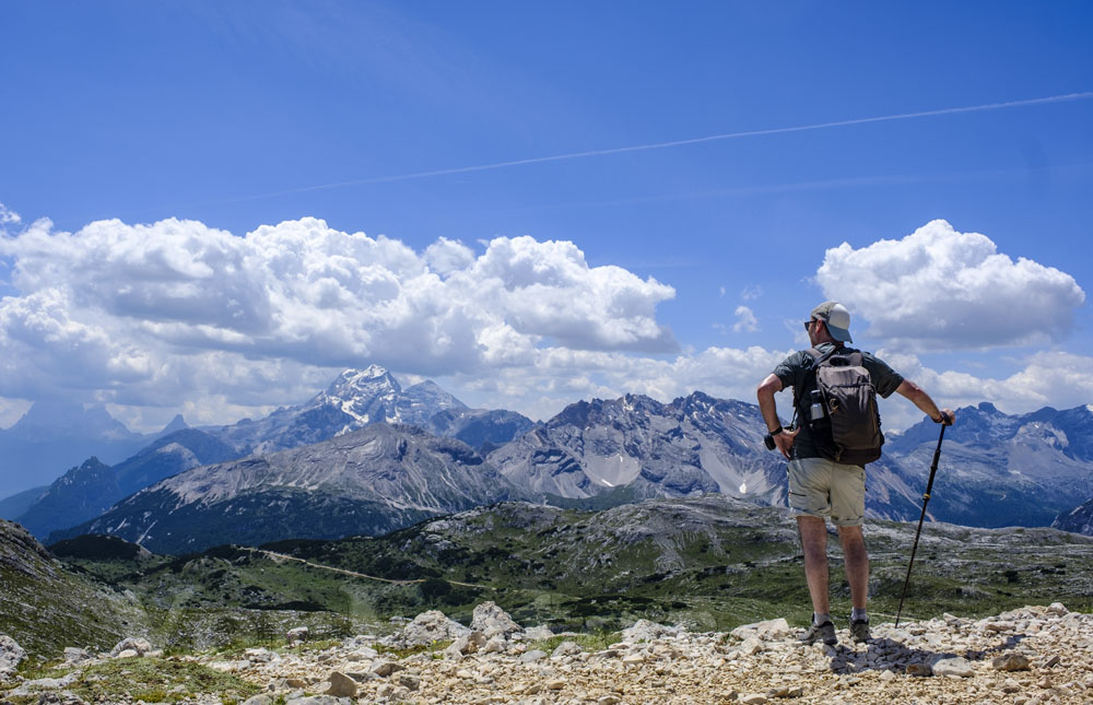 Un senderista explora el paisaje de las Dolomitas en Italia, admirando sus impresionantes picos y valles llenos de belleza